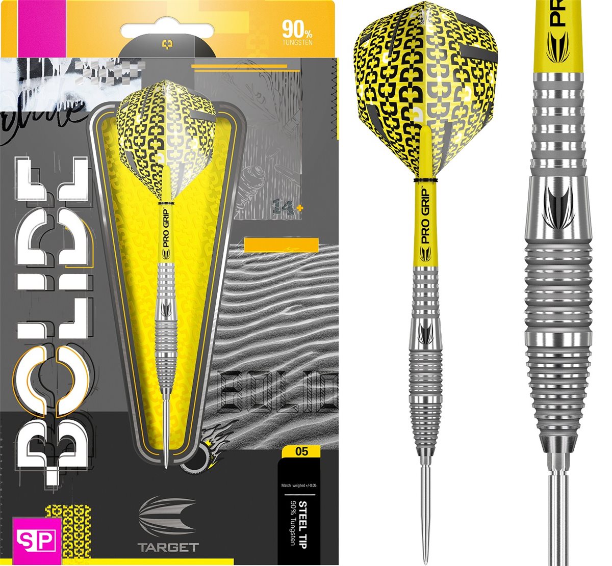 Die Bolide 05 Steeldarts aus dem Hause Target wurden aus hochwertigen 90% Tungsten gefertigt. Der Barrel ist eine kurzgehalten Tropfenform mit einer ausgewogenen Balance. Der Ringgrip im vorderen Bereich, über den Doppelringgrip bis hin zum Sharkgrip im hinteren Bereich fühlt sich der Dartpfeil sehr angenehm in der Hand an und macht den Dart flexibel für mehrere Griffe am Barrel. Abgerundet wird der Dartbarrel durch die sandgestrahlten Vertiefungen was sich optisch in einen schönen Grau präsentiert. Die Dartspitzen sind bei der kompletten Bolideserie nicht eingepresst wie bei traditionellen Darts, sondern sie wurden mit dem patentierten und innovativen Swiss Point System ausgestattet. bei diesem System werden die Spitzen nicht wie herkömmlich mit einem Repointer eingepresst sondern mit einem extrem feinen und präzisen Gewinde eingeschraubt. Ein einfacher und Sekundenschneller Wechsel der Spitzen ist somit gewährleistet. Der Dart ist somit optisch einen richtiger Highlight. Zum Dartset werden je ein Satz Target Pro Grip Shafts und Target Flights mitgeliefert.