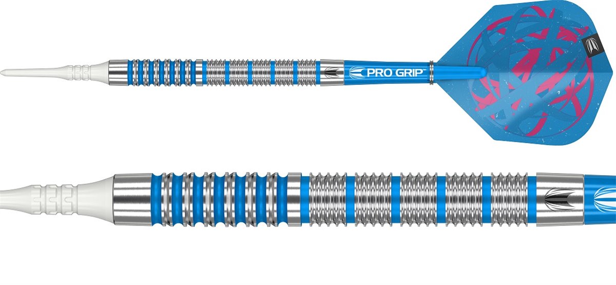 Die Orb 12 Softdarts aus dem Hause Target wurden aus hochwertigen 80% Tungsten gefertigt. Der Barrel hat eine Zylinderform mit einer ausgeglichenen Balance. Über den kompletten Barrel erstreckt sich ein griffige Ringgrip, im vorderen Bereich ein doppelter Ringgrip um hinteren ein feinerer Ringgrip. Dieser E Dart fühlt sich sehr angenehm in der Hand an und eignet sich hervorragend für Spieler die einen mittelstarken Grip bevorzugen. Rundum ist der Dart mit seinen Blauen Highlights optisch ein richtiger Blickfang. Zum Dartset werden je ein Satz Target Pro Grip Shafts, Target Flights und ein Target Wallet mitgeliefert.